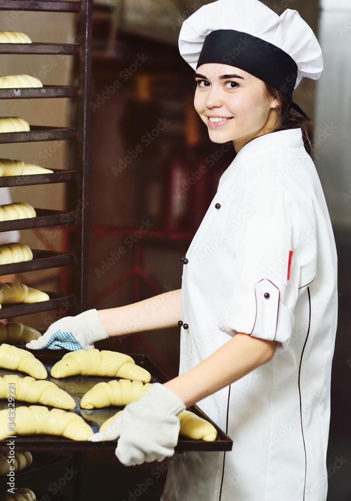 professional Baker - a young attractive woman in a white chef's jacket and cap smiles and holds a tray of raw croissants against the background of a bakery or bread factory.