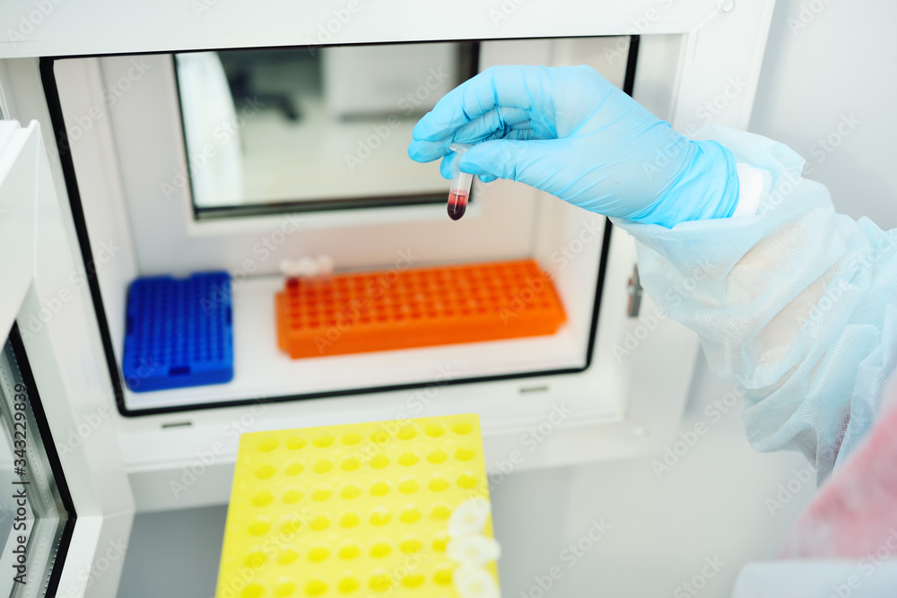 a scientist or employee of a scientific chemical and bacteriological laboratory gives a blood sample to a special laboratory window of DNA PCR. Virology, epidemic, coronavirus.