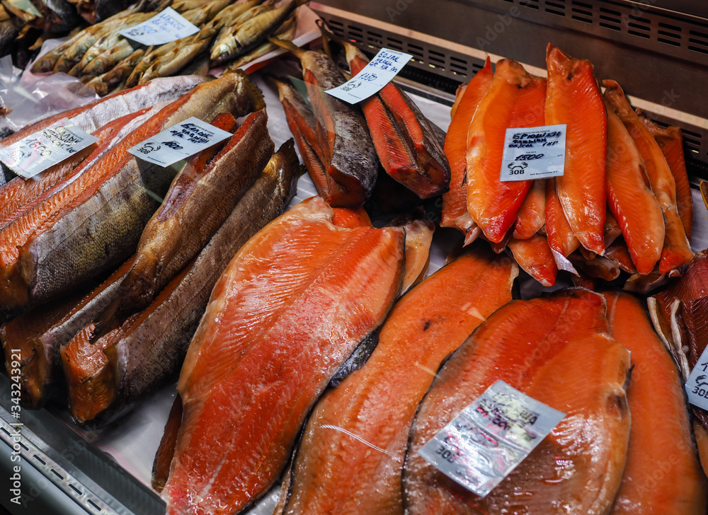 Fish market stall in Sakhalin, Russia. Smoked red fish and dried fish - red salmon, king salmon, quinnat. Delicatessen fish products from the far east of Russia. Fish market in Yuzhno-Sakhalinsk