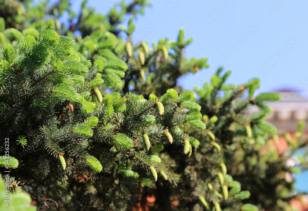 Branch of spring coniferous tree with young cones
