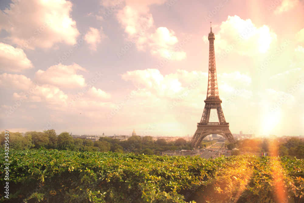 View on Eiffel tower through green summer trees with sunset rays. Beautiful Romantic background. Eiffel Tower from Champ de Mars, Paris, France.