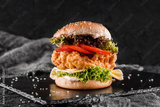 Chicken burger with cheese, tomatoes, lettuce and sauce on slate black background, close up