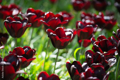 Primo piano di tulipani rosso cupo coltivati all’aperto