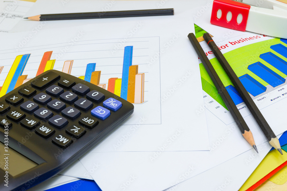 business paper graphs calculator pencil with charts report, concept financial planning, concepts business and cost.
