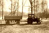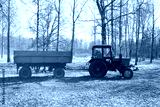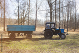 Blue tractor with a hindcarriage in a forest grove lit by bright sunlight