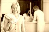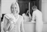 Pretty woman with people in background at spa