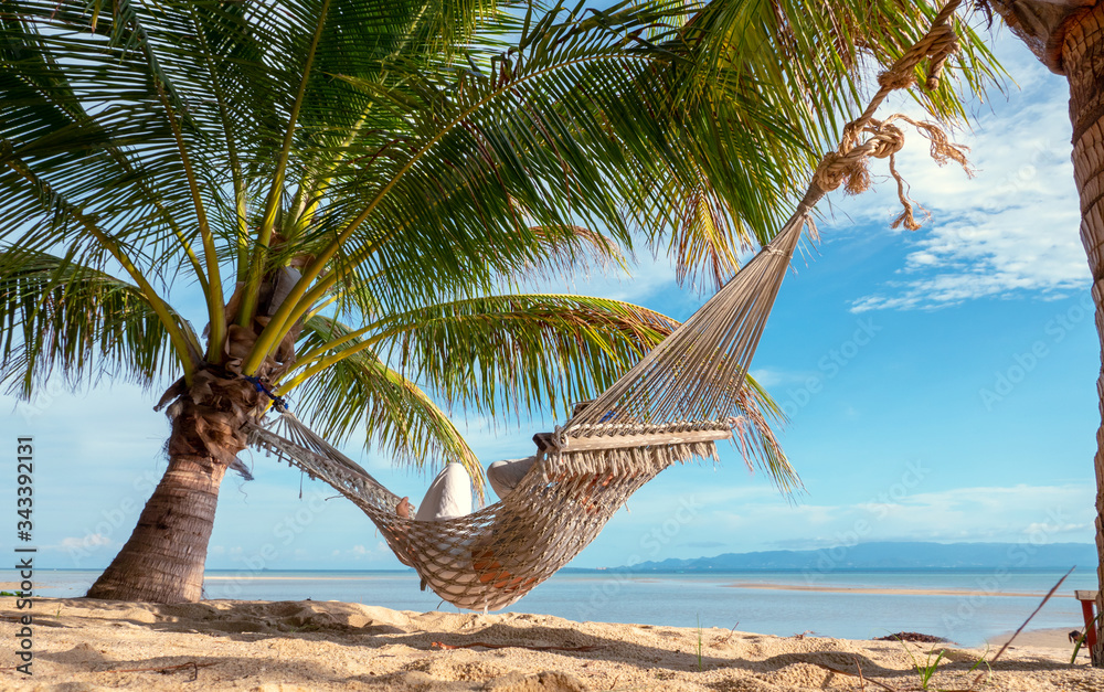 Relaxed woman swinging in a hammock at sand beach of Thailand