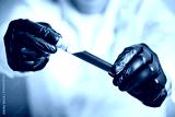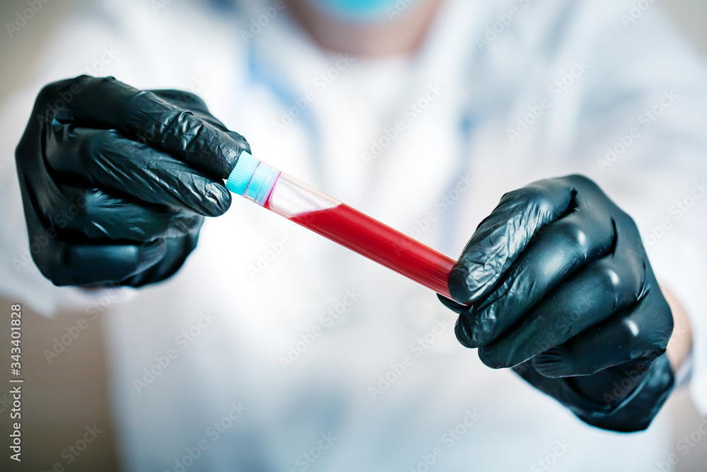 The epidemic of coronavirus. Hand of a doctor holding a bottle of blood sample.