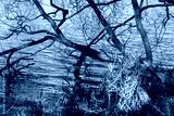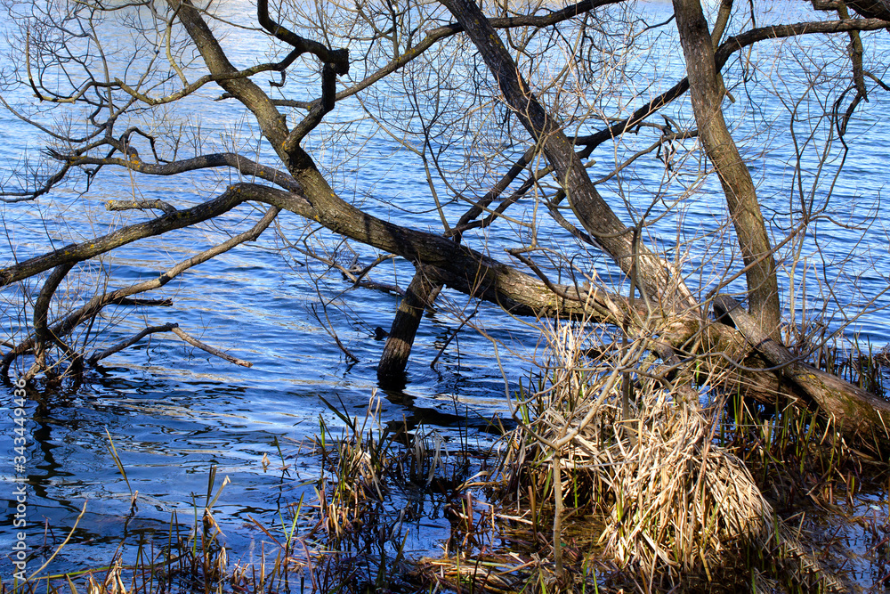 Blue pond with a branches of leaning clumsy tree.