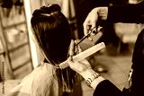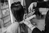 Beautiful young woman getting her haircut by a hairstylist at a beauty salon.