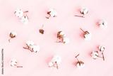Flowers composition. Cotton flowers on pastel pink background. Flat lay, top view