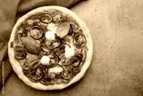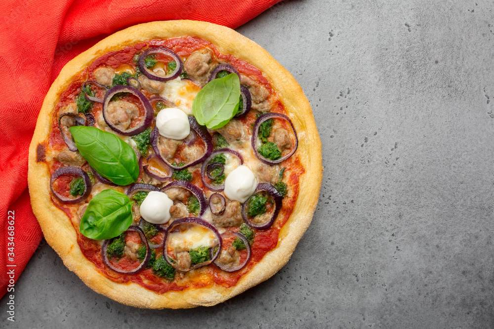 Homemade pizza with mozzarella cheese, tomato sauce, fresh basil leaves, italian salsiccia, red onion. Long dough fermentation.