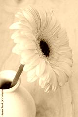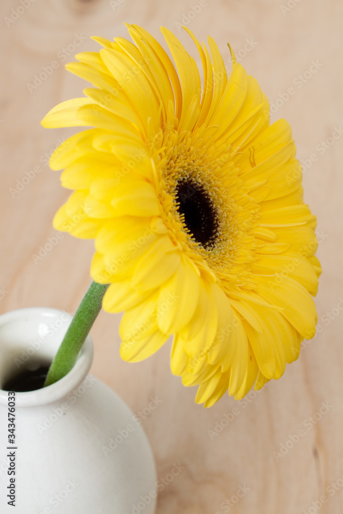Yellow gerbera fresh flower in light ceramic vase isolated on wooden background