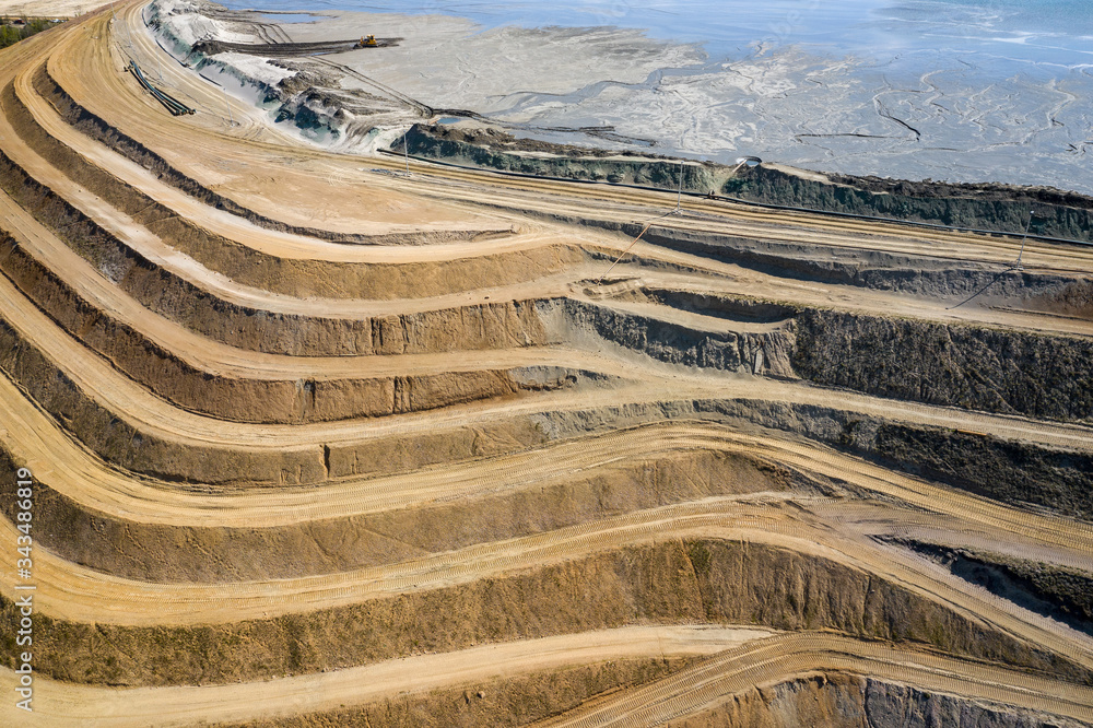 Aerial view of industrial terraces on mineral open pit mine. Opencast mining. Drone view from above.