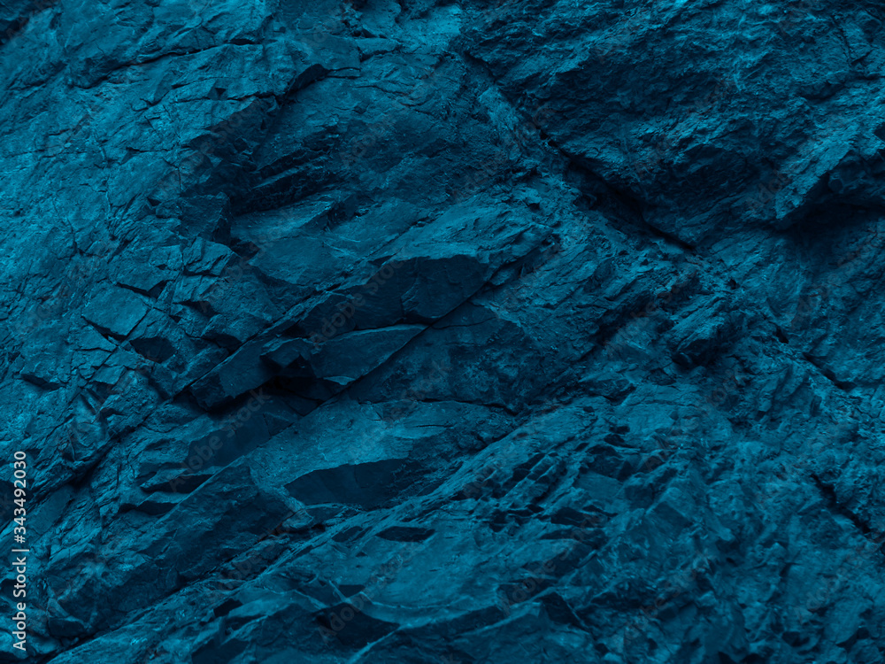 Blue green rock background. Toned mountain texture. Close-up. The combination of dark turquoise color and volumetric stone texture. 3D effect.