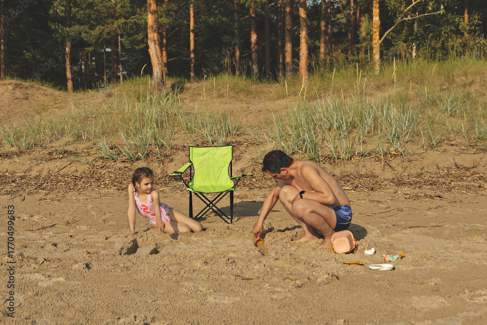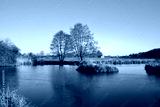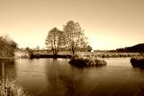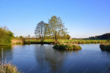 Romantic landscape with a small lake and an island of grass in the middle, on which a swan breeds, with a blue sky in spring