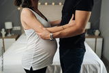 Cropped image of beautiful pregnant woman and her handsome husband hugging belly in their room