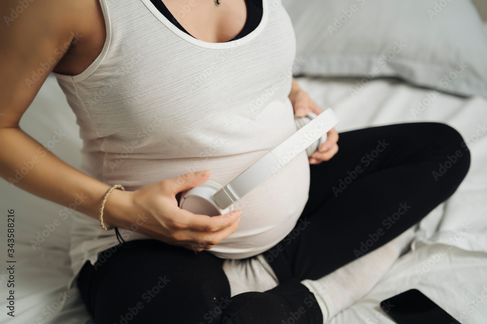 Cropped image of beautiful pregnant woman playing music with headphones on her belly to relax baby sitting on bed in her room