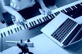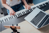 Coronavirus. Quarantine. Online piano music learning with a laptop, education and remote work. Computer, laptop and girl study remotely. Coronavirus pandemic in the world. School closure
