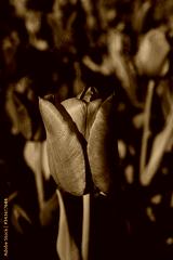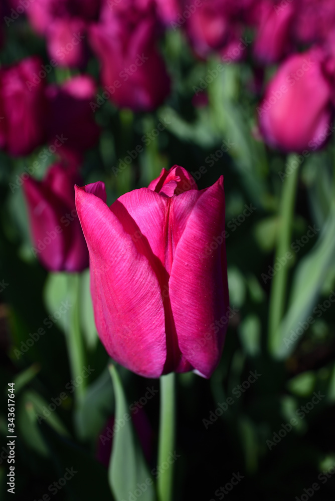 Delicate pink tulips grow on a tulip field in spring and glow in the sun in portrait format