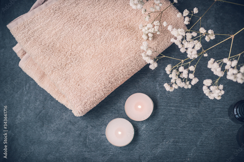 Light fluffy beige towels with spa paraphernalia, candles and flowers on a dark gray background
