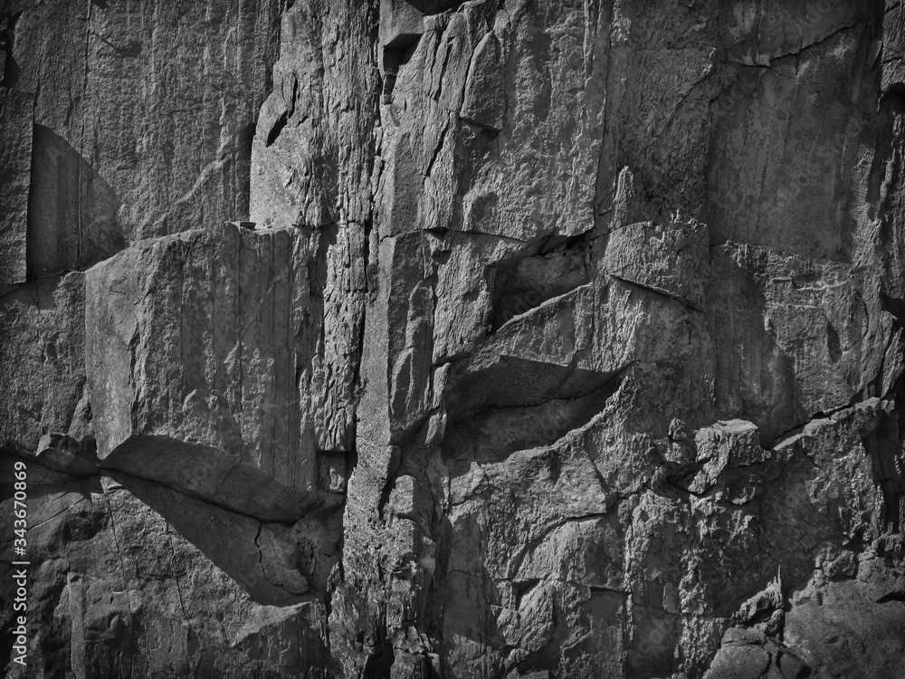 Black white abstract background. Mountain fragment texture closeup. Dark gray rock background. Volumetric mountain texture. 3D effect.
