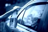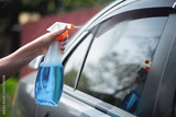 Cleaner is cleaning a car window glass with a rag and detergent close up.