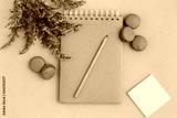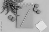 Blank brown vintage notebook, leaves, yellow flowers, pencil, diary, macaroons on purple table. Stylish minimalistic workplace concept. Top view with copy space