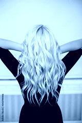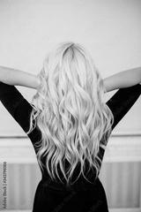 Female back with silver grey ash blonde curly wavy long hair in black dress