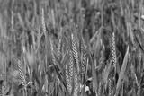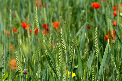 Green ears of wheat among red flowers