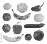Rotten fruits and vegetables isolated on white background