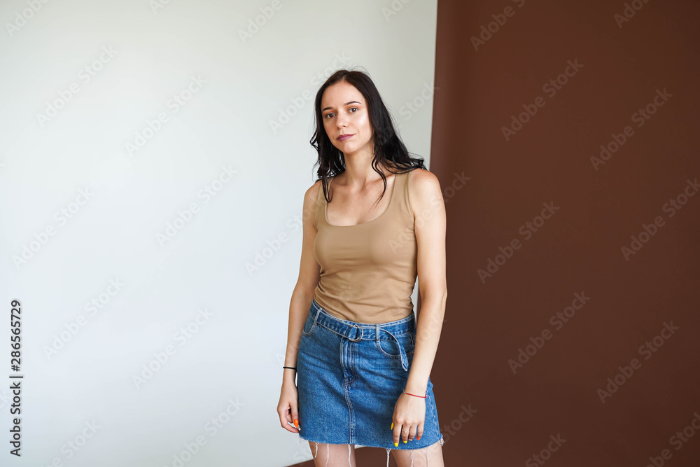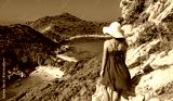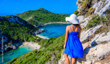 Girl with sun hat at Porto Timoni beach at Afionas is a paradise double beach with crystal clear azure water in Corfu, Ionian island, Greece, Europe