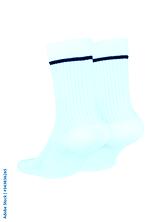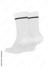 Two white socks with a black stripe isolated on white background. One pair of socks. Set of short socks for sports on invisible foot as mock up for advertising, branding, design.