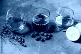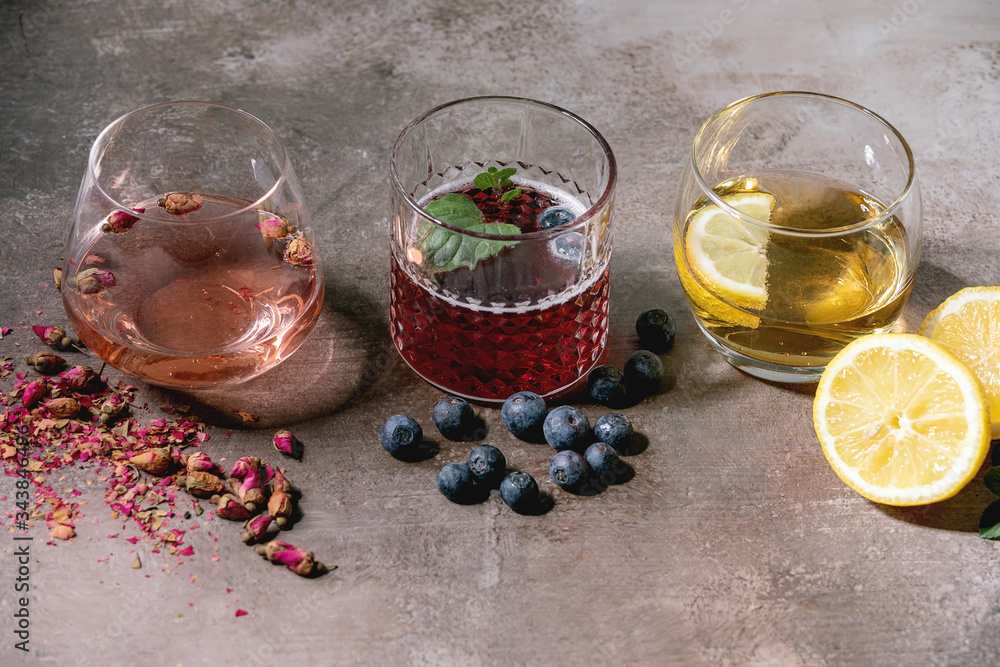 Different cocktail glasses with sparkling colorful drinks pink rose champagne, cider or lemonade with dry rose buds, lemon, blueberries and mint. Ingredients above. Gray texture background.