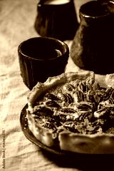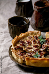 Pieces of home baking classic american pecan caramel pie on ceramic plate, coffee cup, cezve, jug of cream on gray linen table cloth..