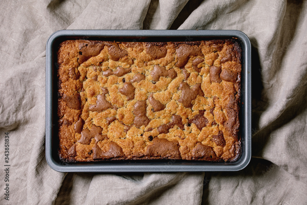 Trend baking Brookies chocolate brownies and cookies fresh baked homemade cake in baking tray on grey linen cloth background. Flat lay, space