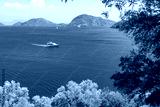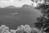 A white luxury yacht is moving fast in the waters of the Aegean Sea. View on a sunny calm summer day from land behind green trees with blue sky and rocky islands in background