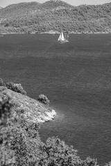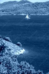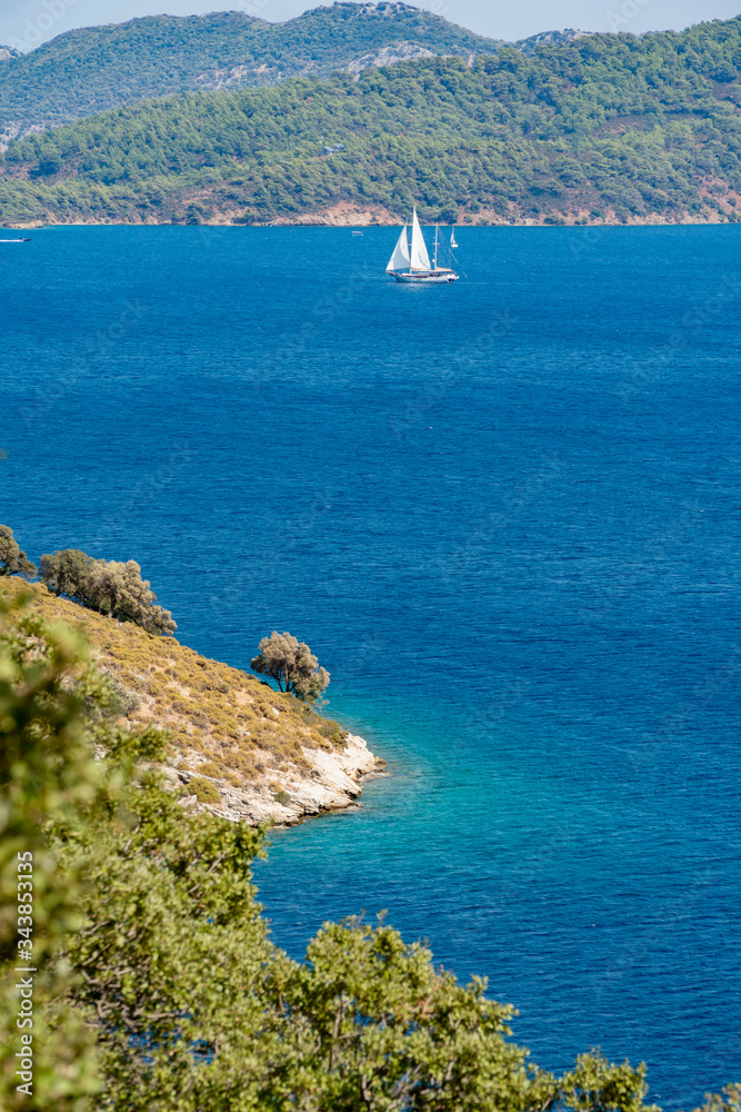 Vertical photo of a travelling sailing boat with open white sails. Green trees and blue waters of the aegean sea with copy space