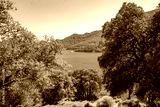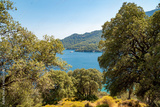 - Summer concept: Trees in front and a forest in distance. Two sailing boats anchored at the Aegean sea with sky background. Natural photo with copy space. Green and blue contrast. No people