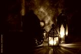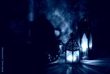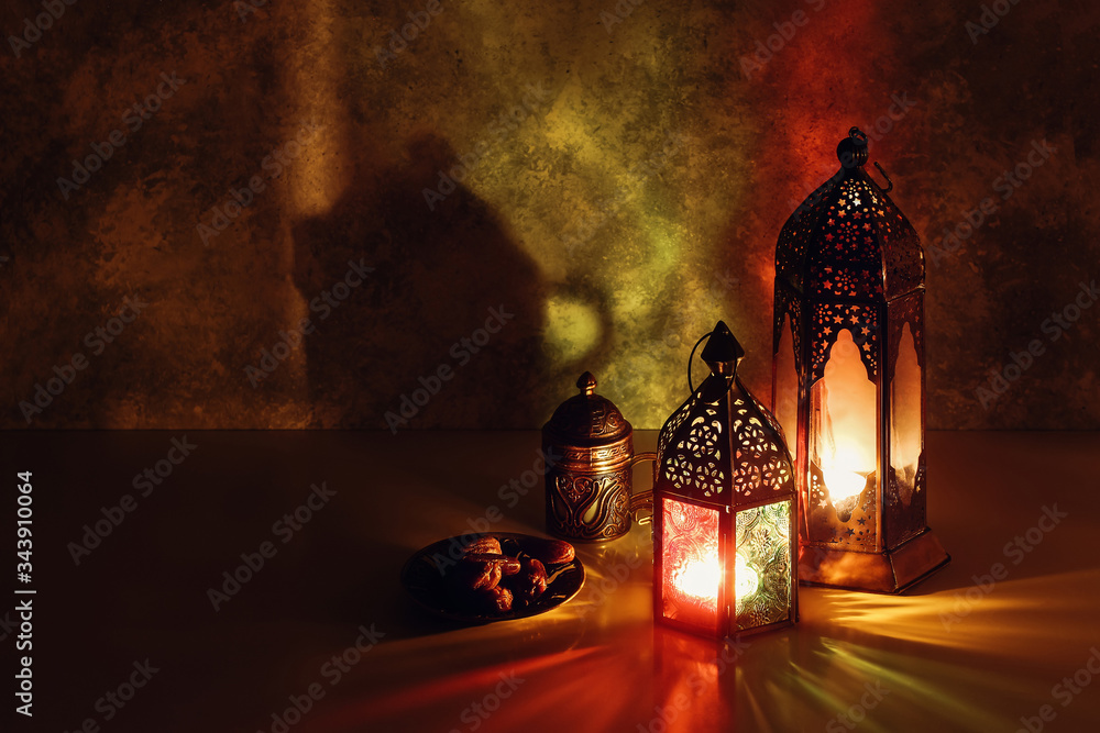 Festive greeting card, invitation for Muslim holiday Ramadan Kareem. Iftar dinner background. Decorative Arabic lanterns glowing at night, cup of tea, coffee and plate with dates on table. Shaby wall.
