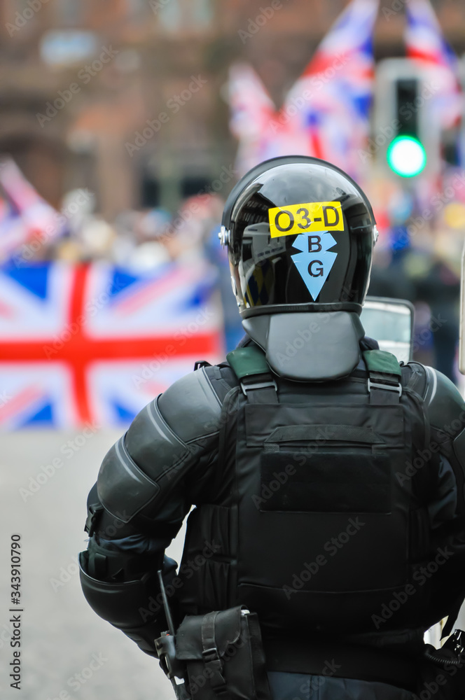 5th January 2013. Belfast, Northern Ireland - A PSNI Officer from the Tactical Support Group (TSG) watches a crowd carrying Union Flags.