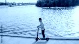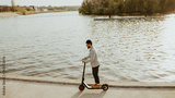 Young hipster man in a suit riding an electric scooter in bright sunny day. Ecological transportation concept.