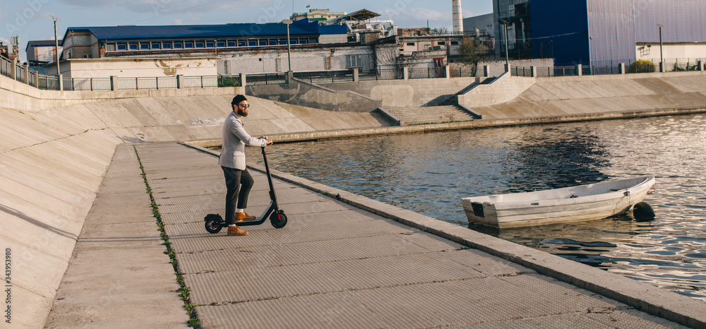 Young hipster man in a suit riding an electric scooter in bright sunny day. Ecological transportation concept.