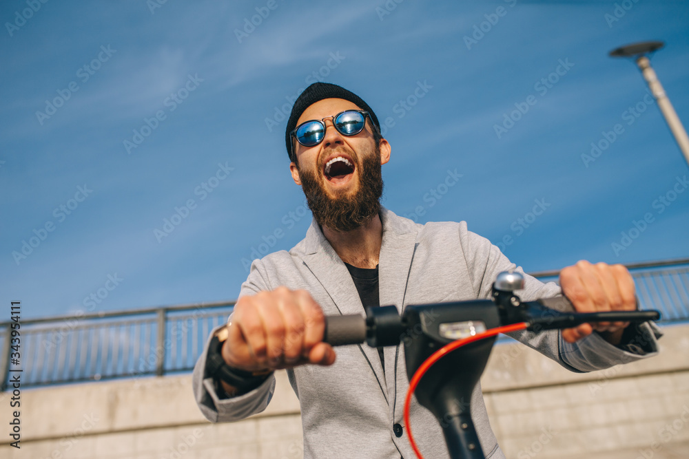 Young hipster man in a suit riding an electric scooter in bright sunny day. Ecological transportation concept.