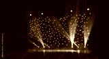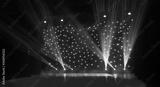 Blurred show background. Empty stage and sparkling stage lights. Blue light beams spotlights on stage at time of entertainment show. Laser and lights show in the dark