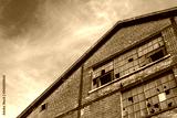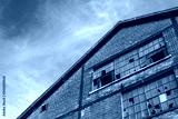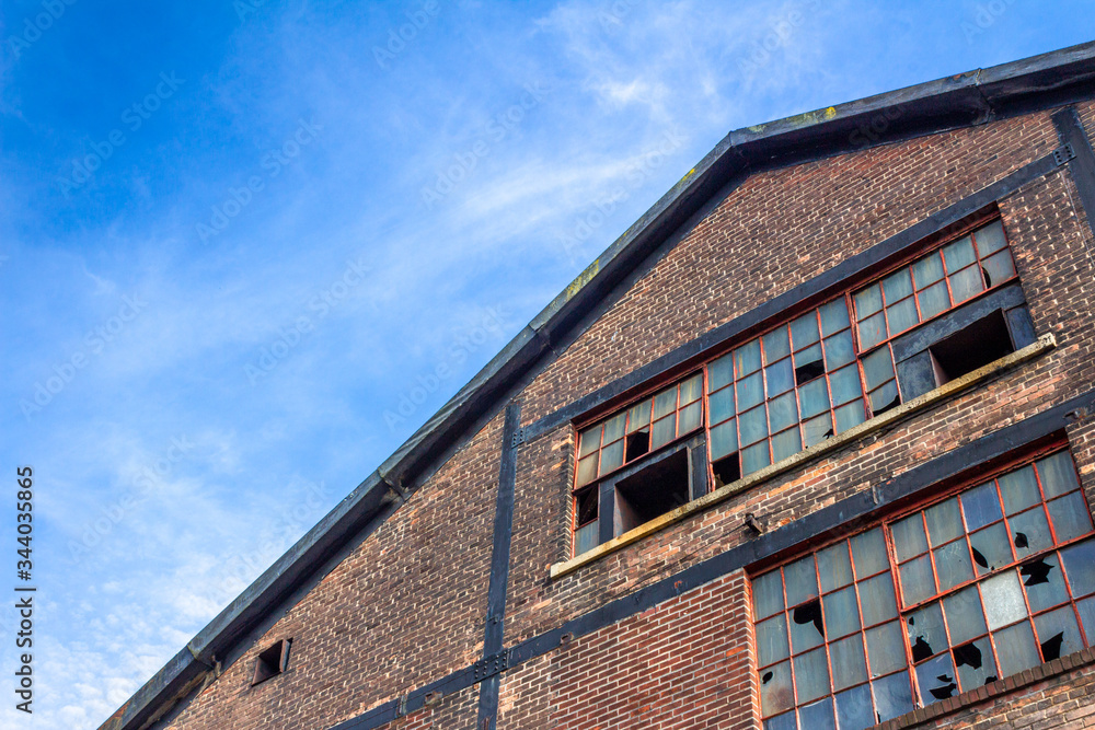 Abandoned warehouse building, brick facade with broken windows, blue sky copy space, horizontal aspect