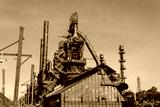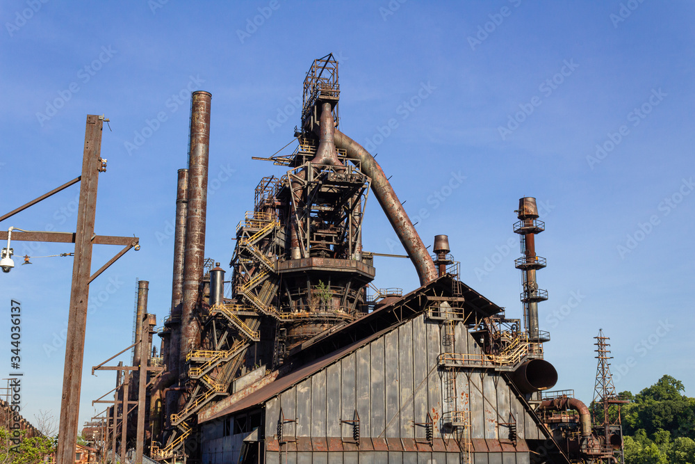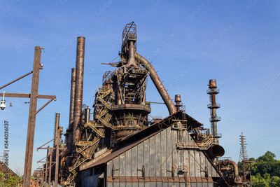 Massive industrial complex, abandoned and weathered furnaces and smokestacks before a deep blue sky, horizontal aspect