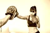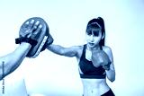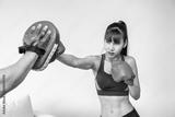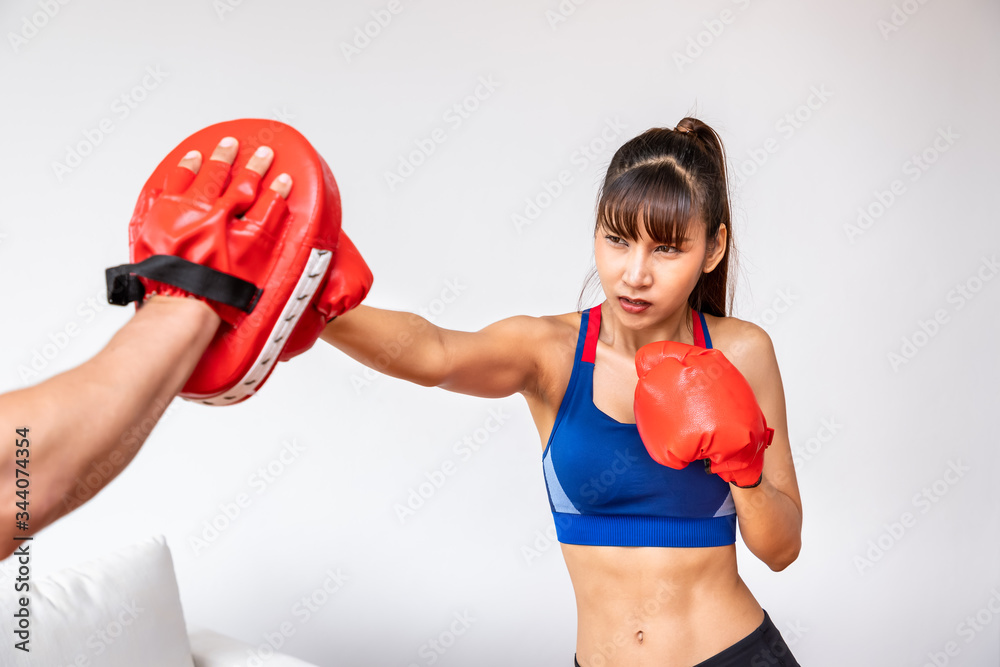 Beautiful woman female practice boxing training with man male handsome coach in living room at home, punching at target
