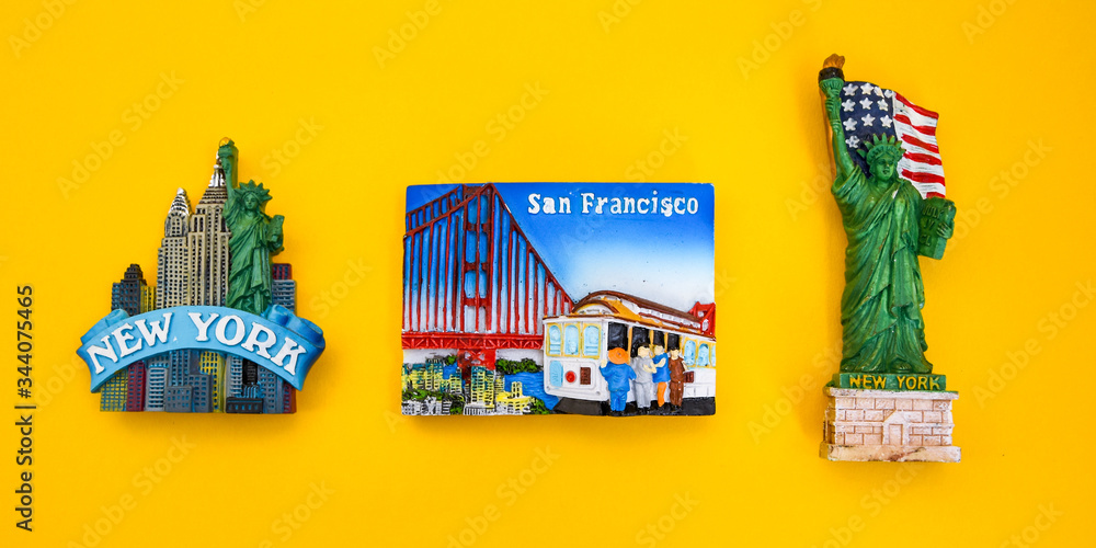 USA with magnets from new york and san francisco on yellow background, travel destination