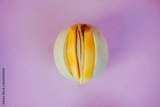 Sliced open melon with yonic fruit assortment over bright colorful background.
